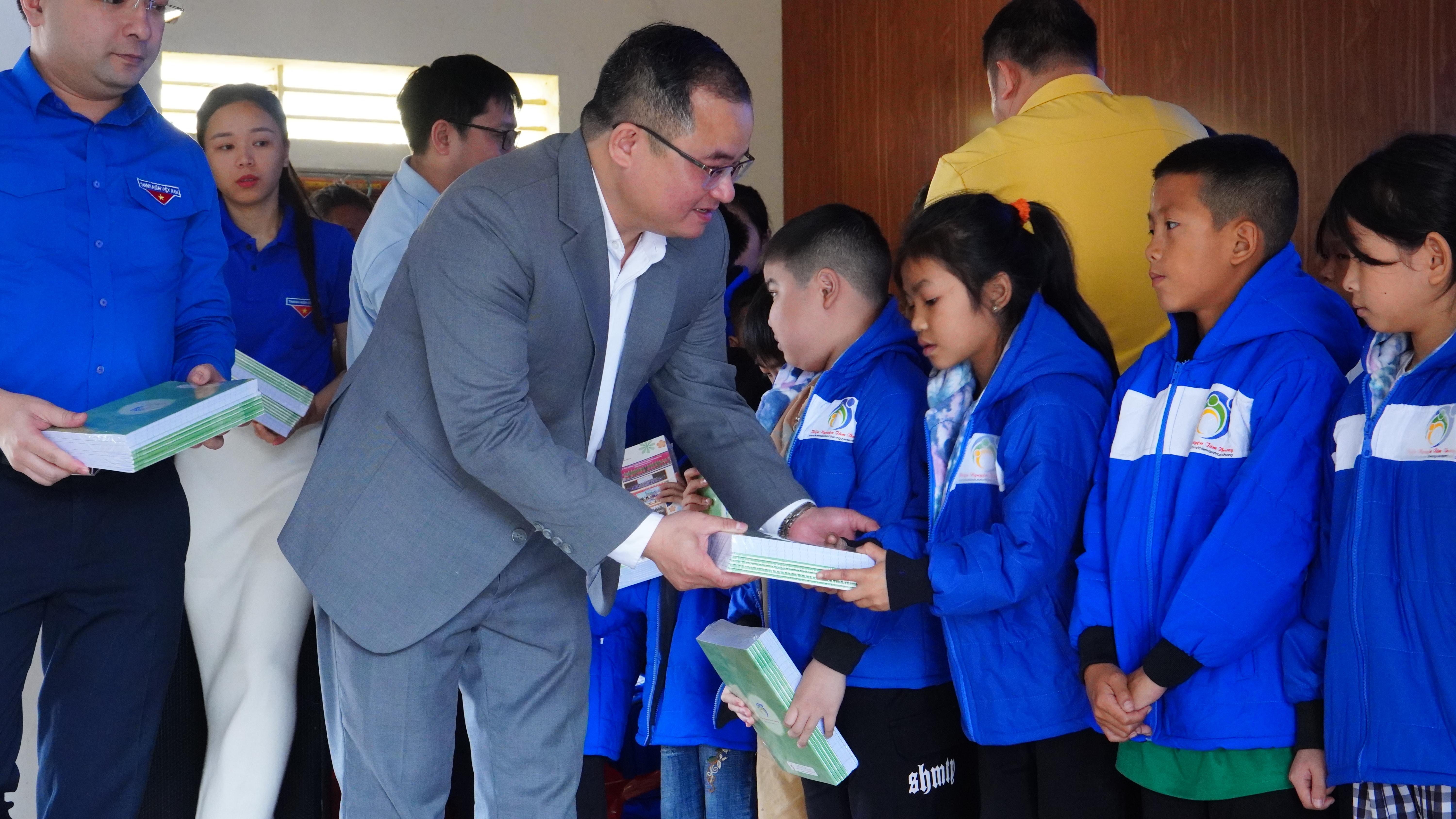 Ông Thái Hồng Đức – TGĐ/ Chủ tịch HĐQT Nhị Vân Media trực tiếp trao tặng sách, vở và quà học tập cho các em học sinh, gửi gắm sự động viên và khích lệ tinh thần vượt khó vươn lên trong học tập.